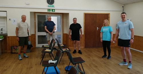 (Pictured: Phil (centre), Frazer the instructor (far right) and regular members of the Mitcheldean wellbeing circuits class 2.)